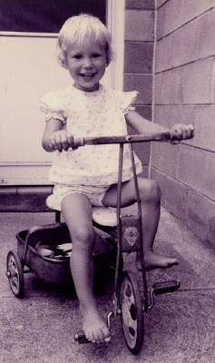 Age two on a tricycle. Note thongs in the back!