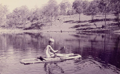 Age 7, on a homemade boat (made by my father) on one of the dams on the farm we owned.