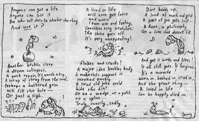 "...Every man should be forced to take his 40th year off. The vast majority of men don't have a life - they pretend to have one. In reality they are lonely, emotionally timid, and miserably, compulsively competitive. One of the main reasons they never get out of this tragic state is that they are enslaved by soulless jobs and careers that lead them to put their lives on hold until retirement. Of course, when this arrives it is too late. While they work they are too busy to think and therefore they have empty lives where they never develop a rich and sustaining inner life....'Our marriages fail, our kids hate us, we die of stress and on the way we destroy the world.' "